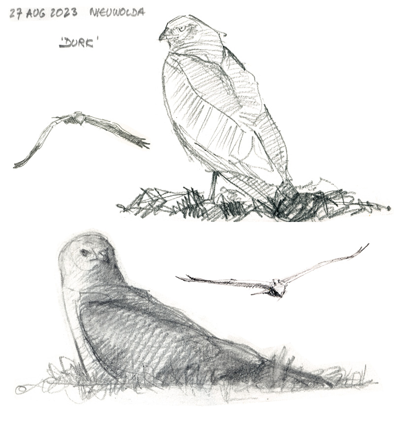 Durk hangt rond achter het erf. Durk is een gezenderd mannetje Grauwe Kiekendief. Hij kreeg zijn zender én zijn naam twee jaar geleden. Het Kenniscentrum Akkervogels wilde de vogel naar mij vernoemen. Veel te veel eer, natuurlijk, en dus werd het Durk, voor intimi Durkie. Dat jaar wist de kanjer voldoende prooi aan te dragen voor twee jongen, ondanks de schaarste aan muizen. Vorig jaar nam hij een sabbatical en zwierf in de omgeving rond. Dit jaar vond Durk weer een vrouwtje, maar het nest mislukte in de eifase, waarschijnlijk na bezoek van een roofdiertje. Ik heb het gevoel dat hij elk moment naar Afrika kan vertrekken. Je kunt Durks fascinerende trektocht volgen op de site van Kenniscentrum Akkervogels.